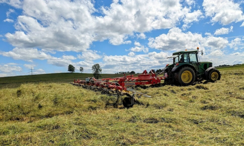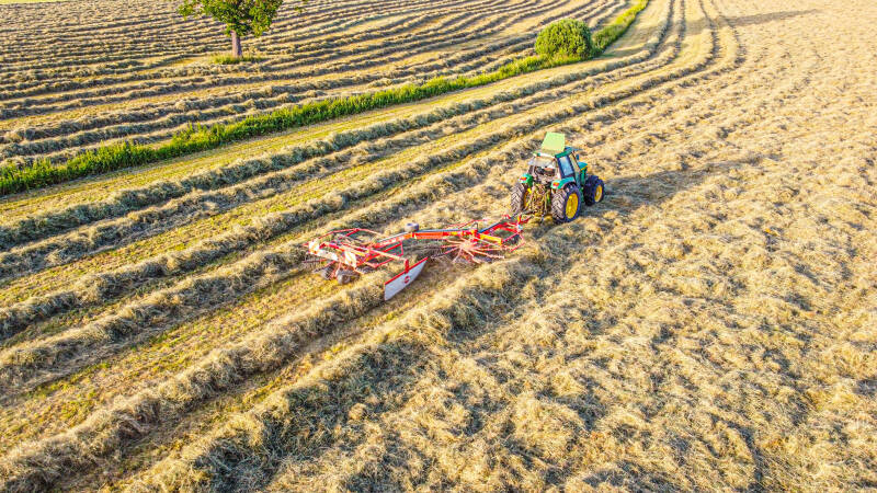 Das Wenden findet direkt nach dem Mähen statt. Dadurch wird das Gras gleichmäßig verteilt und kann durch Sonne und Wind antrocknen. Um beste Qualität zu produzieren, achten wir auf optimale Zinkeneinstellung um Verschmutzungen zu vermeiden. Zusätzlich wenden wir im kompletten Herstellungsprozess nur zweimal um die Blatt- und Blütenstruktur nicht zu zerstören.